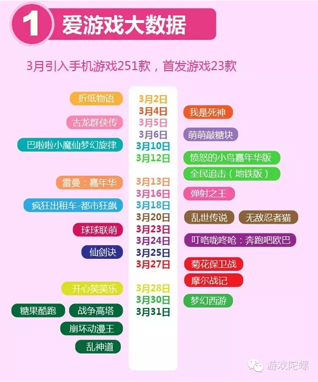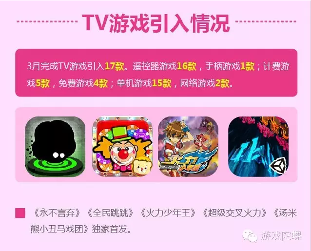 3月份,爱游戏引入TV游戏17款,遥控器游戏16款,手柄游戏1款;计费游戏5款,免费游戏4款;单机游戏15款,网络游戏2款。