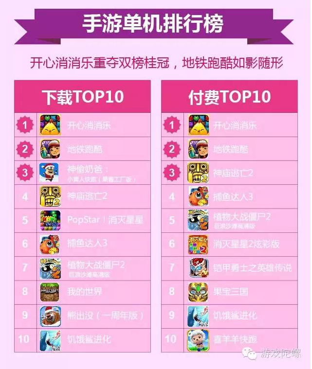 3月的单机双榜中,跑酷类游戏是绝对的大头,占近一半,其次是消除和格斗类型比较吃香。下载榜方面,《开心消消乐》、《地铁跑酷》和《神偷奶爸》分列一至三名,付费榜中《开心消消乐》、《地铁跑酷》和《神庙逃亡2》为前三。