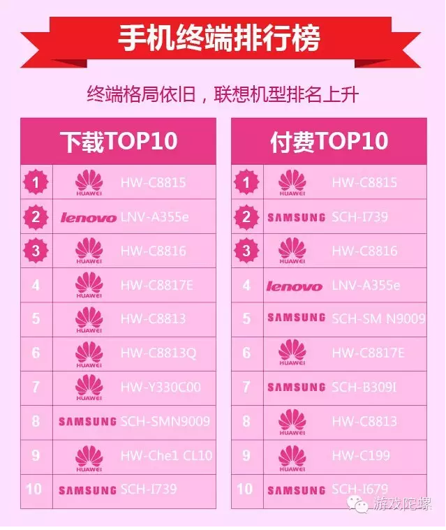 手机终端排行榜格局依旧,以三星和华为为主,联想机型排名上升。作为运营商的主要销售量来源,电信的合约机类型的变化不大。华为总体表现比三星要好,华为的C8815机型霸榜1年,而新面貌来自于联想的A355e,双榜中都表现不俗,占据下载第2和付费第4的位置。