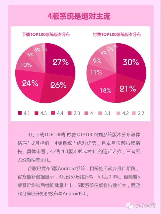 从系统版本看,主流的4版系统份额持续增长,具体看,4.4和4.3版本形成对4.1的追赶之势,三者份额相差无几。另,谷歌近期已发布5版Android系统,目前处于推广阶段,但随着5版本系统终端后续的批量上市,市场份额会逐步持续扩大,据电信爱游戏负责人表示正在做一系列适配,这也成为未来需要关注的点。