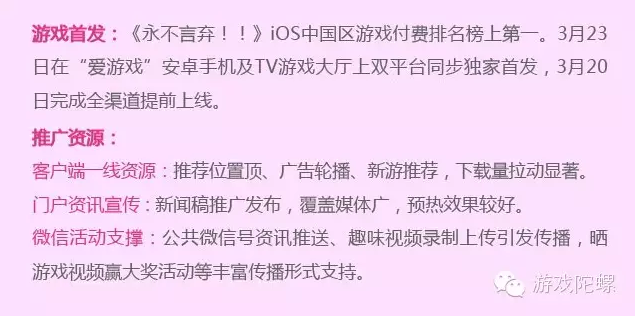爱游戏新游方面持续在网游上发力,其中RPG类是有增无减,像包括有《梦幻西游》、《古龙群侠传》、《我是死神》等,占比高达56%,较2月增长17个百分点,棋牌麻将游戏以18%个百分点排在第二,休闲益智类、动作冒险紧跟其后,分别占7%和6%,从数据看,这类别份额呈下降势头,主要因为国内厂商趋向做网游,这类型出现精品匮乏期,那么,休闲类精品正好是研发们在市场竞争激烈的今天可以去尝试的新机会。